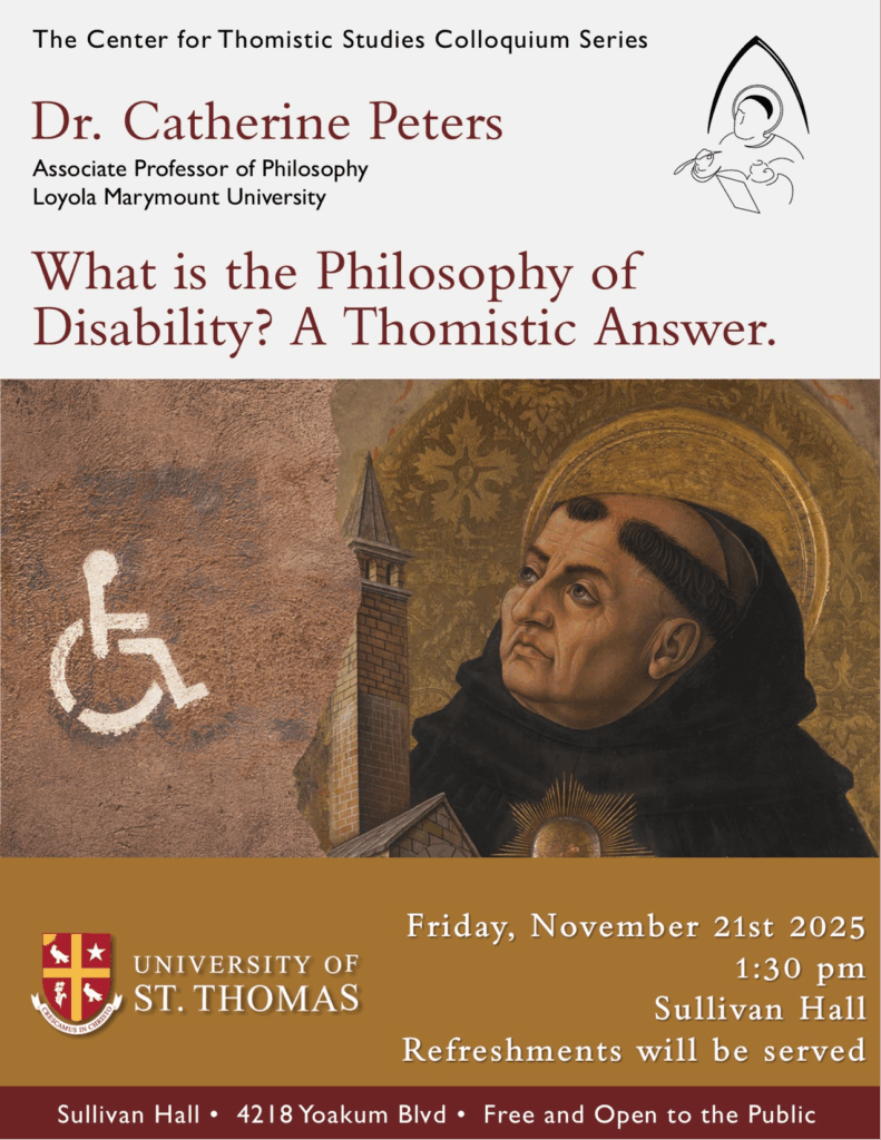 Fellowship of Catholic Scholars board member Dr. Catherine Peters will speak on the philosophy of disability at the Center for Thomistic Studies Friday Colloquium on November 21, 2025. Dr. Peters is an associate professor of philosophy at Loyola Marymount University in Los Angeles.